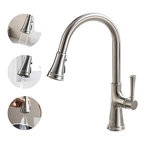 Professional reviews from industry experts Brushed Nickel Kitchen Faucet with Pull Down Sprayer, Oakland Single Handle High Arc Kitchen Sink Faucet Single Hole Farmhouse Kitchen Faucet with 3 Function Spray Head for Laundry RV, KSK1129-BN